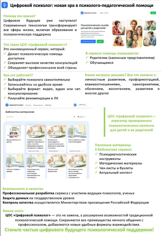 «Уважаемые родители!!! Рады сообщить о запуске нового сервиса психологической поддержки обучающихся – «Цифровой психолог», возможности которого уже доступны всем родителям (законным представителям) обучающихся, немного позже за психологической помощью смогут обратиться Ваши дети. Теперь у вас есть возможность получить квалифицированную психологическую помощь в доступной и привычной форме, без очереди и у профессионалов в сфере образования. Что это такое? Это современный онлайн-сервис, который позволяет консультироваться с профессиональными психологами, обсуждать волнующие вопросы в безопасной обстановке. Темы для обсуждения: школьные проблемы и успеваемость, отношения со сверстниками, близкими людьми, самоопределение и выбор пути, вопросы воспитания и развития детей с ограниченными возможностями здор